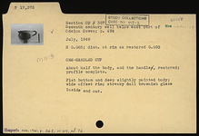 | Description: | The handle and about half the body restored in plaster; profile complete. Flat bottom; deep slightly pointed body; wide offset rim. Streaky dull brownish glaze inside and out. | |
