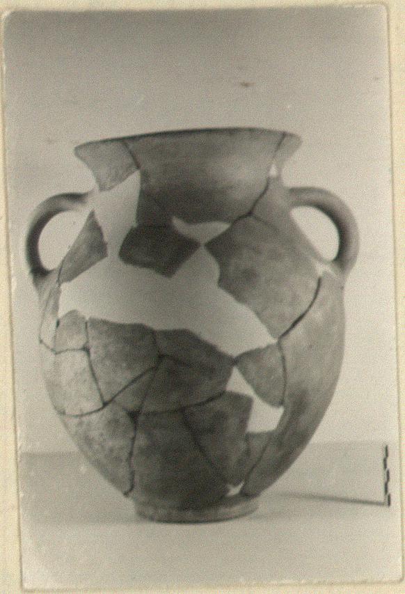 | Description: | Body fragments and one handle restored in plaster. Ring foot; plump ovoid body, curving up to flaring round rim; vertical rolled handles, from shoulder to middle of neck, with finger hollows at their bases. Coarse micaceous clay with grits and pits. Handmade. Kitchen ware amphora. | |