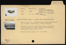 | Description: | About half the circumference preserved, mended from many fragments, bottom missing. Vertical rim set off from body of Late Roman D bowl by heavy ridge and ornamented with careless spirals in thin white paint. Pinkish-buff clay; thin red wash. | |
