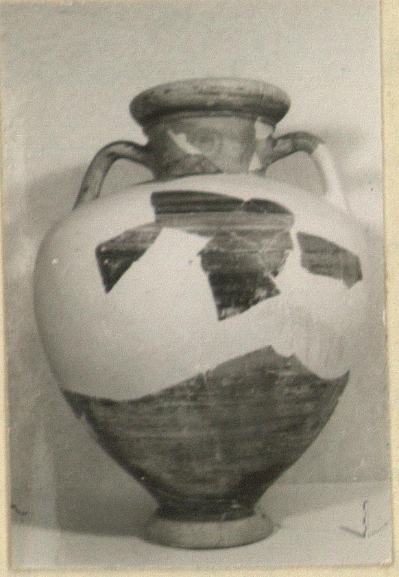 | Description: | Central part of body restored. High flaring ring foot and plump ovoid body; slightly concave neck, rounded rim; below rim, raised ring around neck; rolled vertical handles, from shoulder to middle of neck. Entirely covered with dull streaky glaze, black to brown, except for four reserved bands on the shoulder below the handle attachments; the neck is entirely reserved and decorated at back and front with double concentric circles, with double sigma to each side. | |