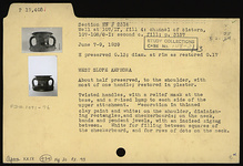 | Description: | About half preserved, to the shoulder, with most of one handle; restored in plaster. Twisted handles, with a relief mask at the base, and a raised lump to each side of the upper attachment. Decoration in thinned clay paint and white: on the shoulder, diminishing rectangles and checkerboards; on the neck, bands and pendent jewels, with an incised zigzag between. White for filling between squares of the checkerboard, and for rows of dots on the neck. | |