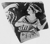 Description:   Fragment from a bell krater. Draped woman dancing right and looking back at a dancing bearded silen.