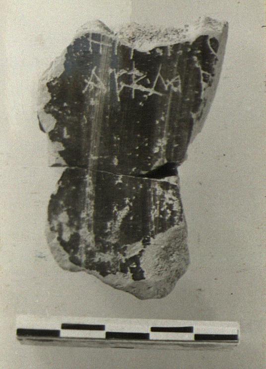 | Description: | Fragment from the wall of a large pot with firm glaze, black to red, outside; streaky glaze inside. The inscription chipped above and broken off at the right: <graphic> | |
