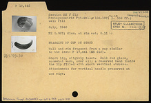 Description:   Wall and rim fragment from a cup similar to P 17441 (ΞΞ 212). Short lip, slightly inset. Dull red glaze, somewhat worn, over all; a reserved band inside the lip filled with short vertical strokes. Attachments for vertical handle preserved at one edge.