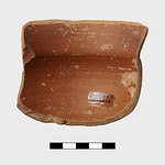 Description:   Rim and upper wall fragment preserving attachments of vertical band handle. High rim, inset and tilted slightly outward. Covered over all with thick dull red glaze; a reserved band inside the lip, and the handle banded. Glaze completely gone from rim outside.