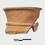 | Description: | Shoulder, neck and rim fragment. Wide rounded shoulder and straight neck slightly tilted outward; projecting rim, flat on top. At junction of shoulder and neck, a raised ridge, vertically and diagonally grooved in imitation of cable pattern. Above this, at base of neck, impressed circles apparently in various patterns; zigzag and crenellations are recognizable. At one side the pattern is double; a wavy line above the pattern at the base of the neck. In places on the neck, shallow vertical zigzags or wavy lines incised while the clay was soft. Thick fabric of coarse pink clay containing fairly coarse gravel. | |