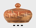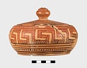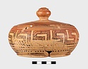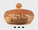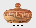 Description:   Pyxis: mended from many pieces, chips and small fragments missing. Hatched maeander between bands on body; lower down, a row of dots. Lid: two small fragments and top of knob missing. Decorated with a row of staggered dots between bands. Zigzag on round knob.