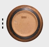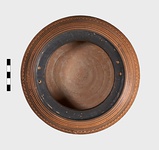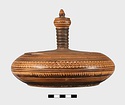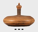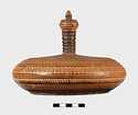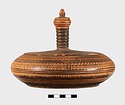 | Description: | Pyxis intact. Around the body, a band of single zigzag, a band of triple zigzag, and a band of rays, all set off by glazed bands. Lid mended from two pieces; decorated around the outer part with a row of dots between bands, and a triple ring of bands around the base of the handle. Handle tall, ribbed below; a round knob with conical finial on top. A ring of dots between bands around the knob, the finial banded. | |