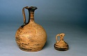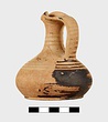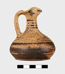| Description: | Intact save chip from end of spout. Trefoil mouth; tall narrow neck; squat body; low flat base. Shoulder decorated with three large crisscrossed triangles and a single line of vertical maeander beside the handle on one side. Bands around neck and below shoulder; the lower part of the body black. Worn black glaze. | |