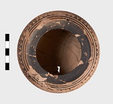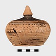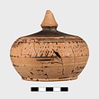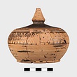 | Description: | Pyxis, mended from many pieces, chips missing. Triple zigzag band around body; narrow bands above and below. Lid, mended from two pieces, chips missing. Black save for bands at edge. Banded conical knob. Black to brown glaze, worn on body and knob. | |