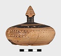 | Description: | Pyxis mended from many pieces; chips and a few small fragments missing. Quadruple zigzag between bands around body. Lid mended from several pieces; chips missing. Black save for three reserved stripes near center. Knob, black below, then conical, banded, above. | |