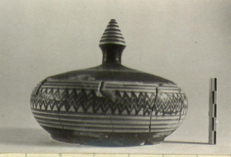 | Description: | Pyxis mended from several pieces; chips missing. Triple zigzag between bands around body. Lid, mended from several pieces; chips missing. Black save for three reserved stripes near center. Knob, black below, conical and banded above. | |