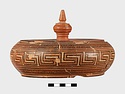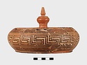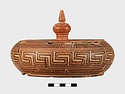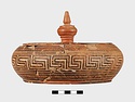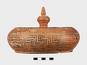 | Description: | Pyxis mended from many fragments; chips missing. Hatched maeander around body, with single zigzag above and below, all set off by bands. Lid mended from many fragments; chips missing. At outer edge, a row of dots between bands. Knob, ribbed below, then round, with band of chevrons; then tall conical, banded. | |