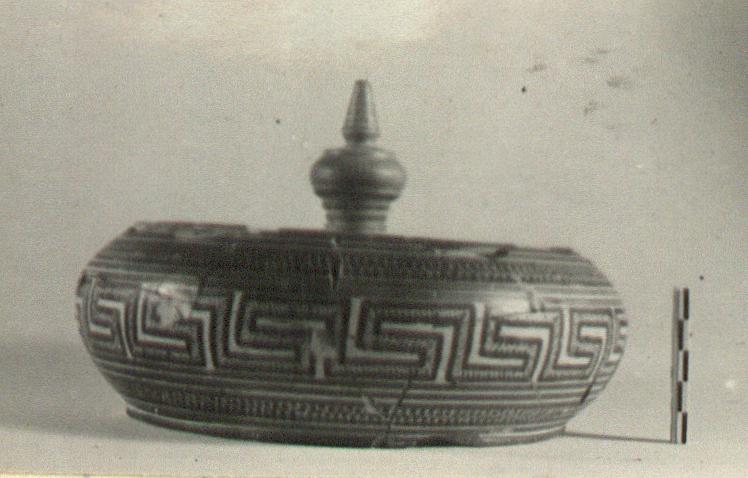 | Description: | Pyxis mended from many fragments; chips missing. Hatched maeander around body, with single zigzag above and below, all set off by bands. Lid mended from many fragments; chips missing. At outer edge, a row of dots between bands. Knob, ribbed below, then round, with band of chevrons; then tall conical, banded. | |