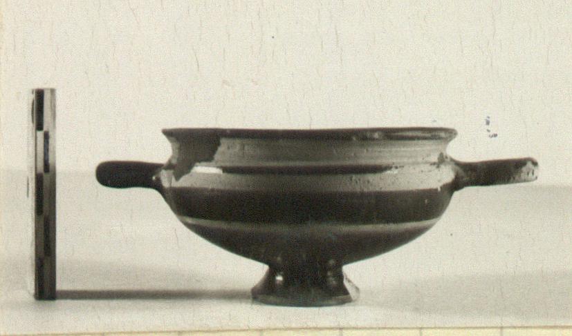 | Description: | Part of rim and body missing. Reserved, offset rim; reserved band lower on body and reserved line around inner edge of lip. Conical foot. | |