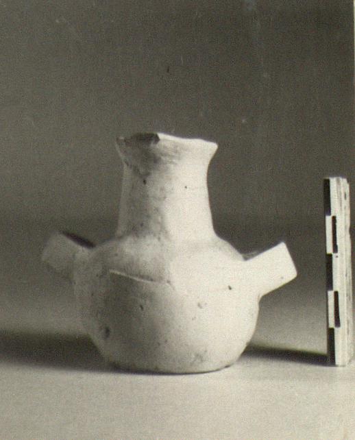 | Description: | The vertical band handle (lip to well down on body) missing, and about half the rim; otherwise intact. Plump body on broad flat bottom; wide neck and slightly flaring lip. Broad band handles. Handmade of pale buff clay. | |