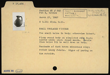 | Description: | Two small holes in body, otherwise intact. Plump round body on simulated ring foot; narrow neck; plain round mouth. Handle from below lip to well down on body. Handmade of dark brown micaceous clay; rather heavy fabric. Signs of paring on the outside. | |