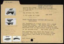 Description:   Two fragments of a large pyxis with a broad horizontal flange. The outer edge of the flange reserved and set off by a groove, and decorated with an egg pattern made by incising in the unbaked clay. The lower part of the incurving wall above the flange also reserved, this also decorated with a large egg pattern, here drawn carelessly in glaze.
