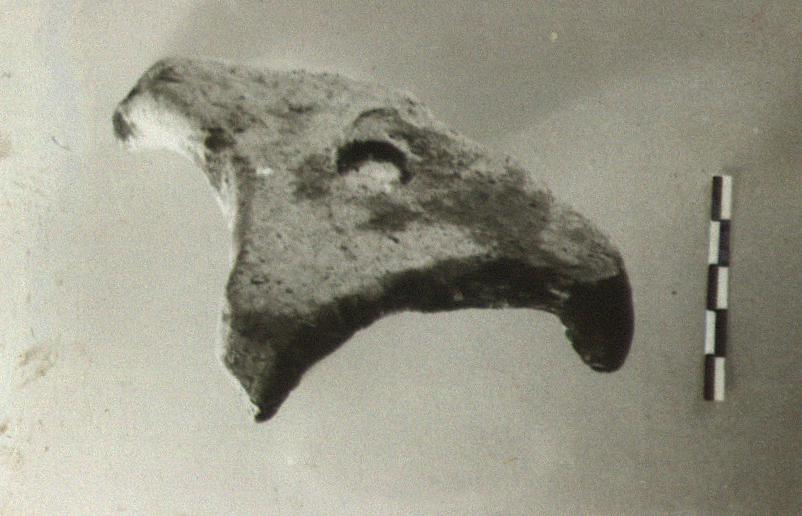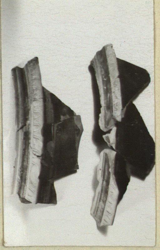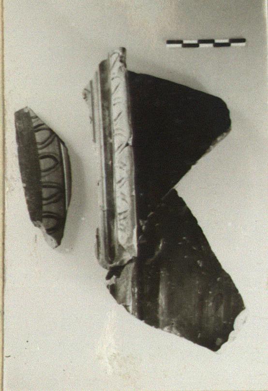 | Description: | Two fragments of a large pyxis with a broad horizontal flange. The outer edge of the flange reserved and set off by a groove, and decorated with an egg pattern made by incising in the unbaked clay. The lower part of the incurving wall above the flange also reserved, this also decorated with a large egg pattern, here drawn carelessly in glaze. Dull black glaze. ADDENDA P 21112 is a non-joining fr. of this pyxis. Several additional fragments, one joining, the others found in tin ΝΝ 399 (cistern at 69/ΜΖ = B 18:13). | |