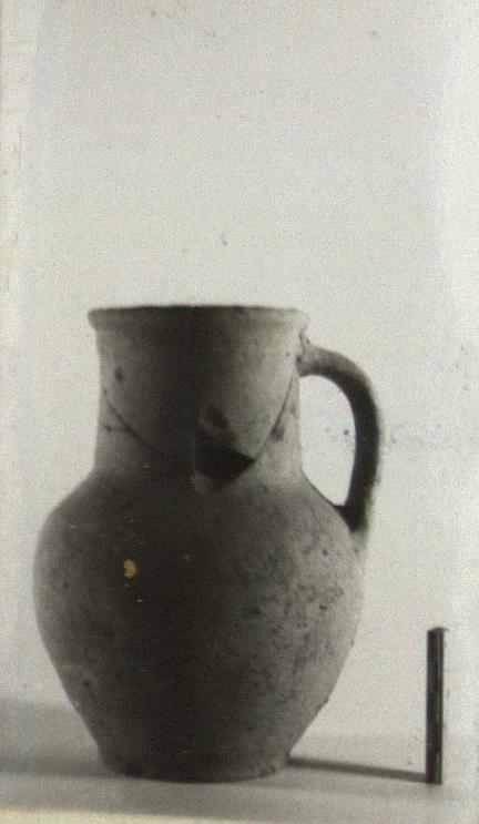 | Description: | The neck broken and mended; part of the rim missing. Similar in shape to P 17518 (ΝΝ 2359) but considerably smaller and the rounded rim less marked. Buff clay, unglazed. ADDENDA P 17518: Low flat base, slightly projecting; plump ovoid body. Wide straight neck with rounded lip; a raised ring at the point of the upper handle attachment. Vertical band handle. | |