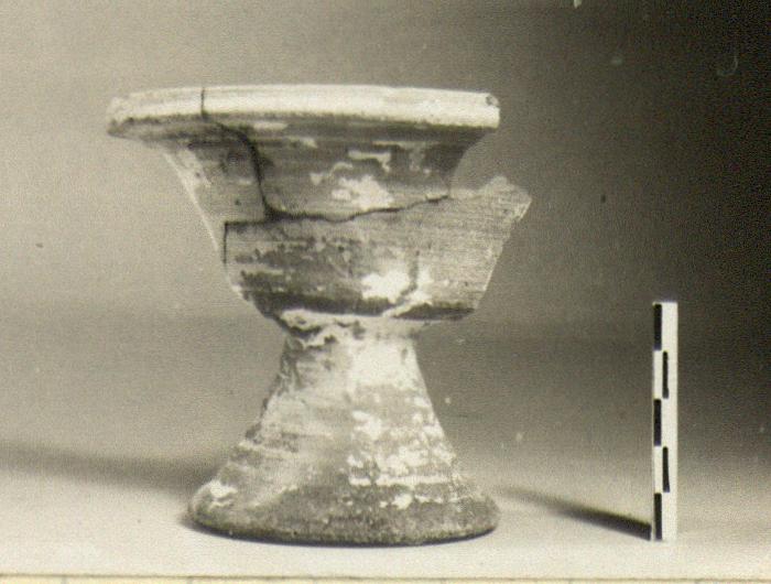 | Description: | Fragments of rim and body missing; one fragment does not join. Open bowl with flaring sides and rim; high conical foot. Brownish clay; dull green surface over which a white slip, now much flaked. Traces of burning in the bottom. Cf. Agora V, p. 91, under no. M 74. | |