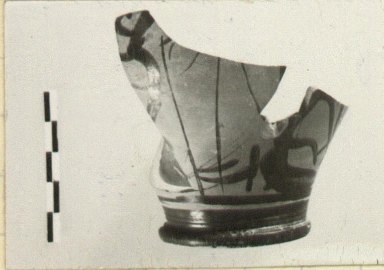 | Description: | Three joining fragments preserve foot and some of lower part of body. On body, two large palmettes under handles and on each side a large draped standing figure. Body drawn in sharply at bottom. Low ring foot; underside reserved with glazed dot and circle. | |