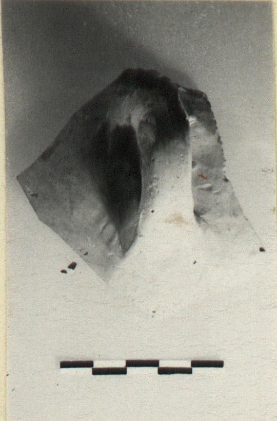 | Description: | Fragment from wall, with short vertical handle round in section. Beginning of spring for rim preserved at edge of break above handle. Rather thin clean fabric, yellow brown at core, light buff on surface. Prehistoric Sherd. | |