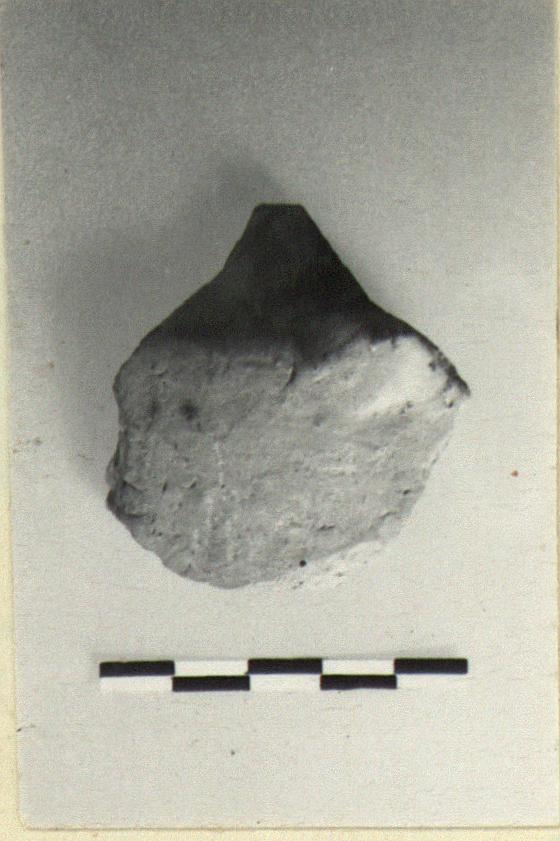 | Description: | Fragment with a bit of almost vertical slightly inset rim and part of body of shallow bowl preserved; small lug at angle of body and rim. Rather fine clay, gray at core; light brown and micaceous at surface. Yellow Minyan? Prehistoric. | |