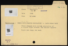 | Description: | Twice stamped with motif consisting of a figure-eight between two maeander squares. Light red clay; red wash. Late Roman B. | |