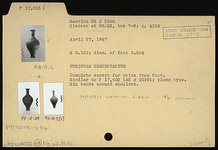 | Description: | Complete except for chips from foot. Similar to P 17602 (ΝΝ 2559): plump type. Six bands around shoulder. | |