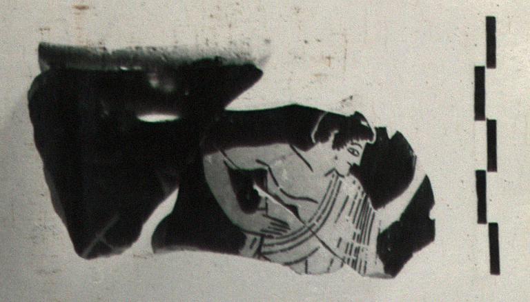 Description:   Red figure oinochoe fragment mended from four fragments; a few chips missing. Part of the rim and wall of a mug (oinochoe shape VIII). On the exterior, the upper part of a youth looking right; his cloak over his left shoulder, his left arm raised; his right hand on his hip. Behind him an uncertain object; beyond, next to the break, the outline of the head and shoulder of another figure, left. No relief contour. Inside, a reserved line at the junction of lip and wall.