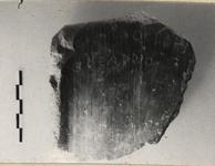 | Description: | Fragment of a curved cover tile; one edge preserved. Incised on glazed side: <graphic> Dull brownish glaze on upper face. | |
