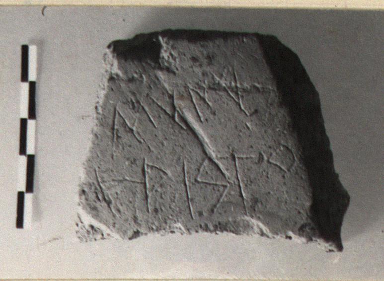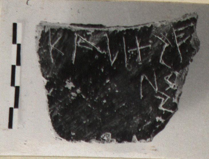 | Description: | From the wall of a very heavy open pot. Incised inside: <graphic> Dull black glaze inside, none outside. | |