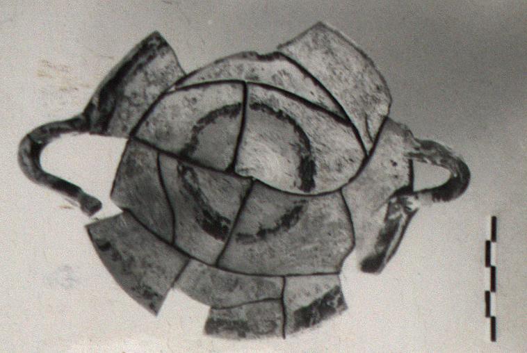 | Description: | Fragments of rim missing. Flat bottom, plain rim with ribbon handles at edge. Broad glaze bands inside; unglazed outside. | |