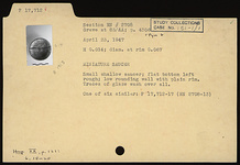 | Description: | Small shallow saucer; flat bottom left rough; low rounded wall with plain rim. Traces of glaze wash over all. | |