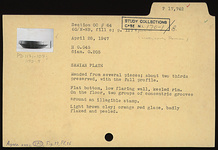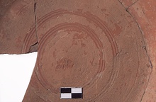 Description:   Mended from several pieces; about two-thirds preserved with the full profile. Flat bottom, low flaring wall, keeled rim. On the floor, two groups of concentric grooves around an illegible stamp.
