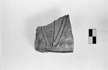 | Description: | Part of angular shoulder and side wall of a bowl or cup. In relief on the wall, the top of a large-veined pointed leaf; at either side small blobs, grooved, suggesting flowers. Light buff fabric; glaze dark green inside; light to dark greenish blue on outside. | |