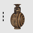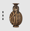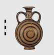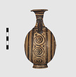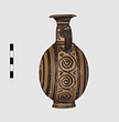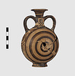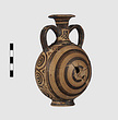| Description: | Complete save minor chips. Concentric circles on wide faces, running spirals on narrow faces. Rather high, slightly flaring ring foot; band handles; projecting lip decorated on top with two reserved bands. Buff clay; black to brown glaze. | |