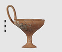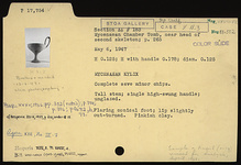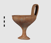 Description:   Complete save minor chips. Tall stem; single high-swung handle. Flaring conical foot; lip slightly out-turned.