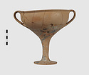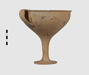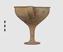 | Description: | Complete save minor chips. Tall stem; two small vertical handles not rising above lip. Small lip out-turned and offset outside. The foot almost a flat disk with a small hollow cone at the center beneath; a groove around its outer vertical face. Pink clay; smooth creamy buff surface on exterior. Unglazed. | |