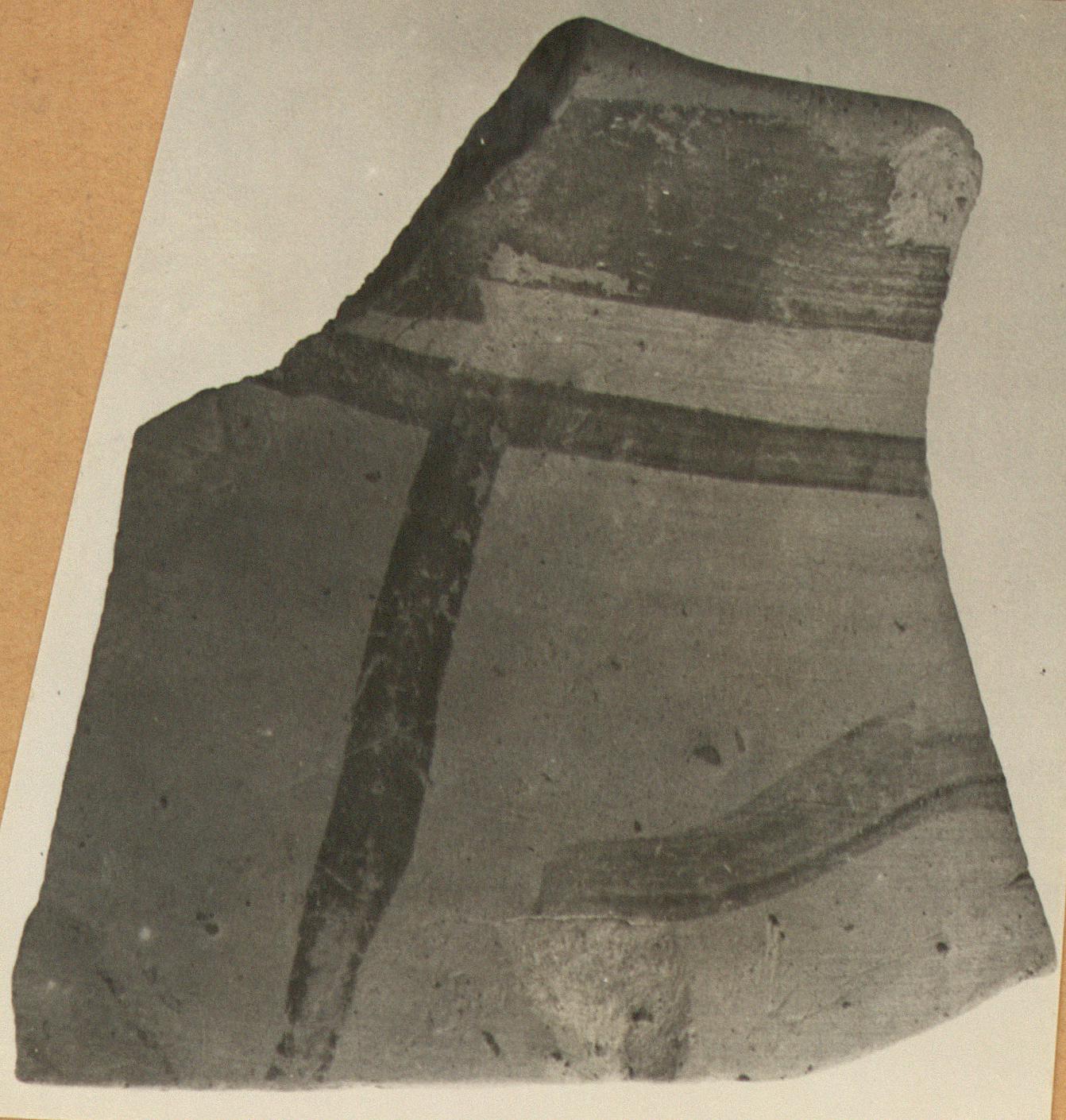 | Description: | Fragment from rim and shoulder. Band around lip; below, a narrow and a vertical band making a panel on the neck with a wavy band in it. Early Orientalizing style. | |