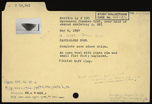 | Description: | Complete save minor chips. An open bowl with plain rim and small flat foot, Pinkish-buff clay; unglazed. ADDENDA Black substance found in bowl in envelope in Study Collections Case No. 19-2. | |
