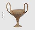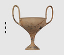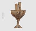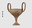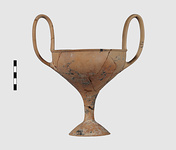 | Description: | Complete save a small fragment and minor chips. Tall stem; two high-swung handles. Flaring conical foot; lip out-turned and offset. Pinkish clay; creamy buff surfaces; unglazed. | |