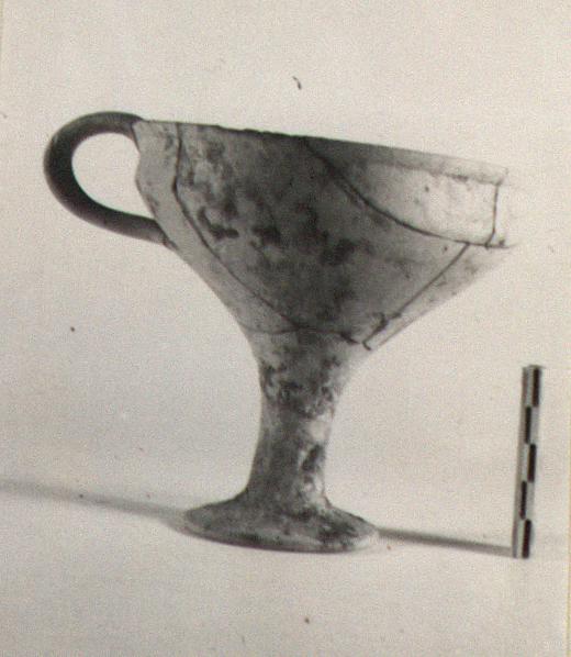 | Description: | Complete save for minor chips. Tall stem; single vertical handle not rising above rim. Similar to P 17756 and P 17760. Pinkish clay; unglazed. ADDENDA P 17756: Tall stem; single vertical handle not rising above rim. The foot flat beneath with a circular depression at the center; narrow lip out-turned and offset. | |
