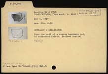 | Description: | From the wall of a coarse handmade pot. Incised inside: <graphic> Micaceous fabric. | |