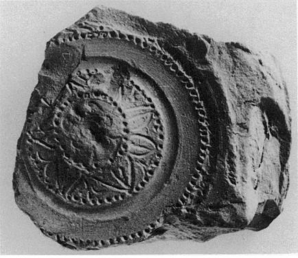 Description:   From mold for bottom of large bowl. Central medallion, head with elaborate headdress, surrounded by band of short petals bordered by lines of sharp dots. Similar line of dots, and the start of some other ornament, on outside of resting surface.