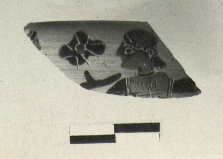 | Description: | Small piece from rim. Standing figure looking to his right, his left arm outstretched. At left edge of fragment, a bit of head and outstretched hand of another figure. Incised blob rosette with purple center in field. Purple for faces, for chiton and on top part of head. Incised details, including hair and ornament on chiton. | |