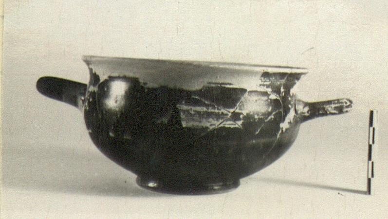 | Description: | Mended from several pieces. Parts of rim and body, and most of one handle, restored. Deep open body; narrow flaring rim; low ring foot. Peeling black glaze inside and out, except under foot. | |