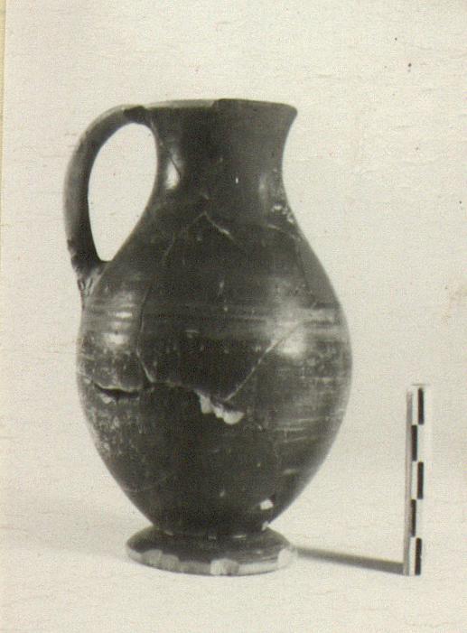 | Description: | Mended from several pieces. Most of rim and other small sections restored. Slightly constricted neck. Strap handle from lip to shoulder. Flaring foot, slightly hollowed beneath. Band of black glaze inside mouth. Under foot and handle reserved. Thin, flaking black glaze on outside. | |