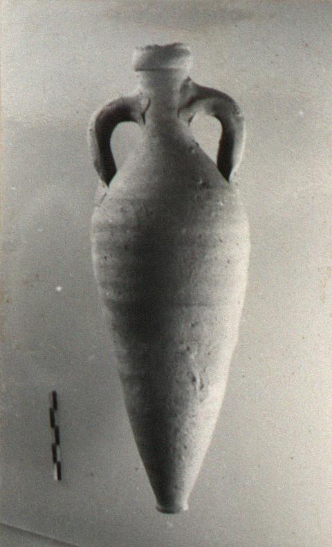 | Description: | Complete. Long pointed body ending in a flat toe; narrow neck with thickened rim. Handles, shoulder to middle of neck. Pinkish-buff clay; unglazed. | |